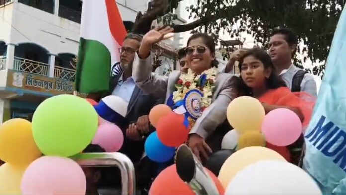 বুধবার মেদিনীপুরের মাটিতে পা দিলেন ইংলিশ চ্যানেল জয়ী মেদিনীপুরের সাঁতারু আফরিন জাবি। আর মেদিনীপুরে পা দেওয়া মাত্রই আবেগে আনন্দে গা ভাসালেন মেদিনীপুর শহরবাসী। ইংলিশ চ্যানেল জয় করার পর দেশে ফিরে দিল্লিতে আত্মীয় বাড়িতে ছিলেন আফরিন। আজ সকালে খড়্গপুরে ফিরে কিছুক্ষন বিশ্রাম নেওয়ার পর বিকেল নাগাদ মেদিনীপুর শহরে প্রবেশ করেন আফরিন। তবে আফরিনের মেদিনীপুরে আসার আগেই তাঁর জয় নিয়ে মেতে ওঠার আয়োজন করেছিল মেদিনীপুর সুইমিং ক্লাব। এদিন বিকেলে মেদিনীপুর শহর লাগোয়া মোহনপুর থেকে শোভাযাত্রা সহকারে তাকে নিয়ে আসা হয় মেদিনীপুর সুইমিং ক্লাবে।