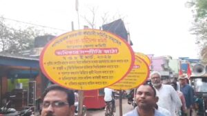 নিজস্ব সংবাদদাতা : পশ্চিমবঙ্গ সরকারের বিরুদ্ধে বঞ্চনার অভিযোগ তুলে এবং চার দফা দাবির সমর্থনে আজ সোমবার ঝাড়গ্রাম শহরে এক বিশাল প্রতিবাদী মিছিলের আয়োজন করল পশ্চিমবঙ্গ সরকারি কর্মচারী সমিতি সমূহর রাজ্য কো-অর্ডিনেশন কমিটি (ঝাড়গ্রাম জেলা শাখা)। আগামী ১৩ মার্চ রাজ্যজুড়ে ‘প্রত্যাঘাত ধর্মঘট’-এর ডাক দেওয়া হয়েছে, আর সেই আন্দোলনের সলতে পাকানোর লক্ষ্যেই এদিন ঝাড়গ্রামের রাস্তায় নামেন সরকারি কর্মচারীরা। ঝাড়গ্রামের সুভাষ পার্ক থেকে শুরু হওয়া এই মিছিলে প্রায় ৮০ জন সদস্য স্বতঃস্ফূর্তভাবে শামিল হন এবং শহর পরিক্রমা করে ঝাড়গ্রাম জোড়া রাস্তায় গিয়ে এই প্রতিবাদ কর্মসূচি শেষ হয়।